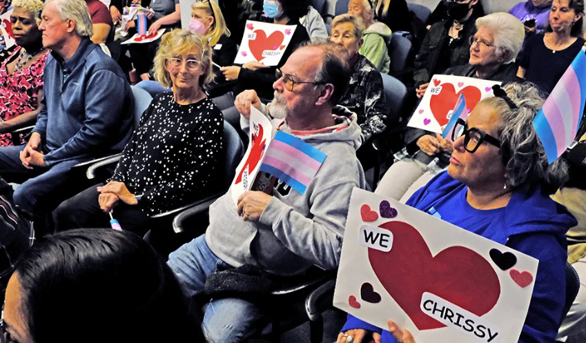 On a night when dozens of friends and allies supported Wood — many with hand-painted signs reading “We (HEART) Chrissy” — the extremes of the issue were on naked display.