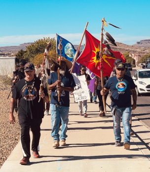 The next day, a larger group met in Kingman, Arizona. They convened in an open lot, shared a prayer circle, organized themselves, and marched for about a mile to the US Department of the Interior, Bureau of Land Management. All along the march, the group were supported by people honking their horns as they drove by in solidarity.