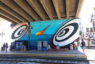 The second mural, located on the train side of the transit center, is titled “Float On.” The complexities of life’s experiences inspired Maxx to create this work that represents grace, stillness and serenity.