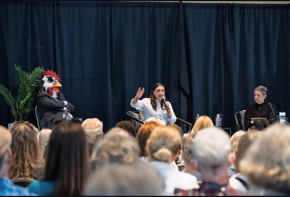August 1, 2025 (Escondido) — Jeering laughter filled the halls of the California Center for the Arts on Sunday as a man in a rubber chicken mask imitated Congressman Darrell Issa before a crowd of hundreds of his constituents.