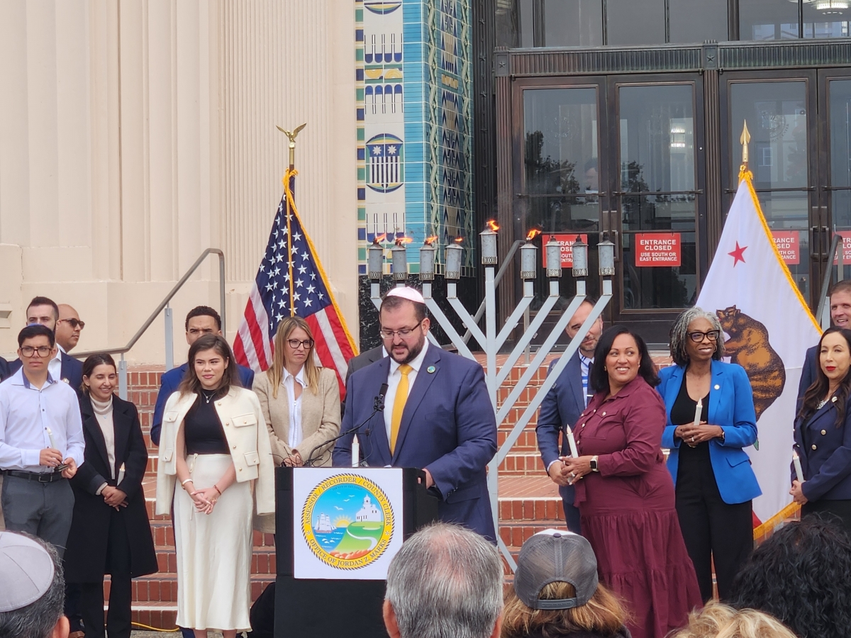 Organized by San Diego County Assessor Jordan Marks (shown speaking in photo above right), Monday afternoon’s "Rally for Light," marked the eighth and final day of Hanukkah, and the hour-long event ended with a ceremonial lighting of a 6-foot hanukkiah (menorah) by local faith leaders, county employees and community members.