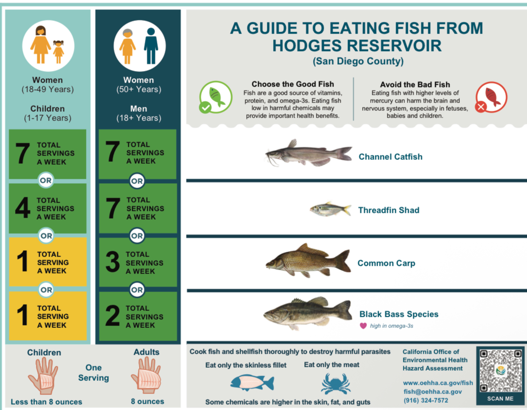October 21, 2025 (Sacramento) - Today, the California Environmental Protection Agency’s Office of Environmental Health Hazard Assessment (OEHHA) issued a new fish consumption advisory for Hodges Reservoir, located approximately four miles south of Escondido, in San Diego County. The advisory provides safe-eating advice for black bass species, Channel Catfish, Common Carp and Threadfin Shad.