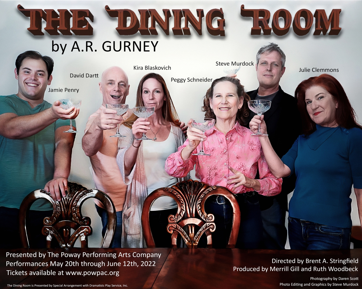 June 14, 2022 (Poway) – The Dining Room, presented by PowPac Theatre, is a comedy of manners, which satirizes behavior of a particular social group, usually upper class. In this case, 19 mini skits intersecting around a dining room table through time. These are snapshots of a dying tradition over time and a showcase of tremendous acting as six actors portray 57 diverse characters. There is no shortage of talent on this stage.