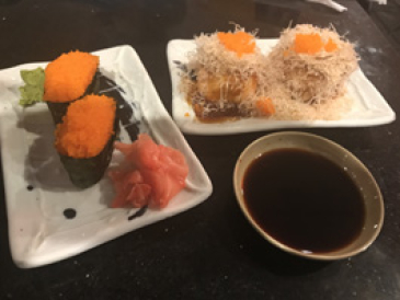 I also tried a new dish this visit, the Volcano nigiri. It’s on the appetizer menu and it is imitation crab (made from pollock and white fish) wrapped in seaweed, wrapped in rice and then wrapped in salmon. It’s baked and then topped with shaved bonito and masago (flying fish roe). I must say, it was phenomenal. I will definitely be ordering that one again. The flavors and textures worked well together and though it was messy to eat as it’s too big for one-bite, and falls apart when cut, it’s super yummy.