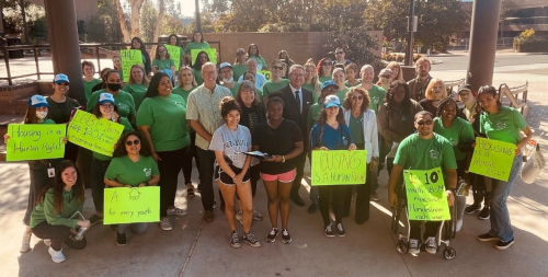November 23, 2021 (El Cajon) -- November is National Homeless Youth Month. Nearly 100 people participated in a rally and march in downtown El Cajon on November 17 to bring attention and awareness to this national crisis, including El Cajon Mayor Bill Wells, Councilmember Steve Goble, and representatives from various non-profit organizations and agencies dedicated to serving homeless youth.