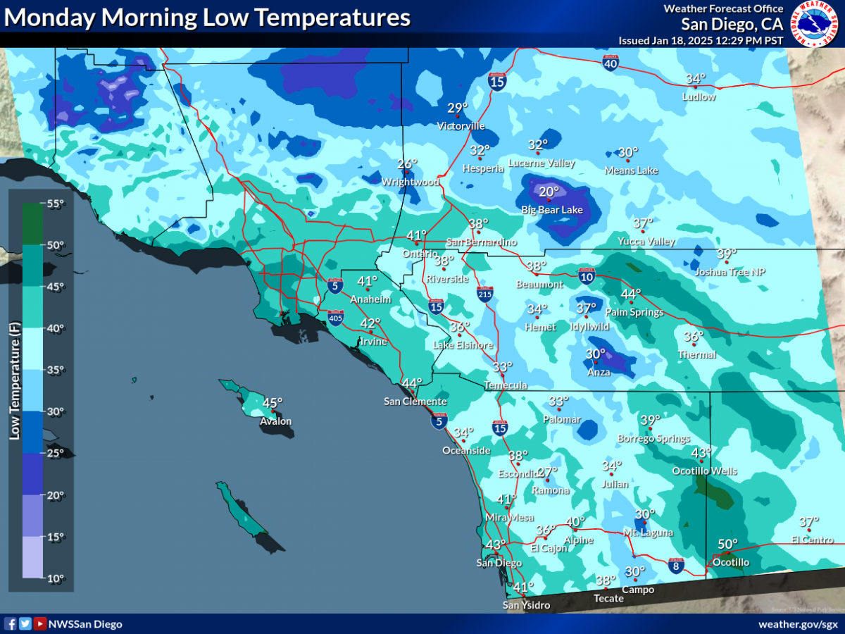 January 19, 2025 (San Diego) – January’s freakish weather continues with both fire danger and frost forecast for this week. The weather hazards line up for a potentially “worse case” scenario, the National Weather Service predicts.