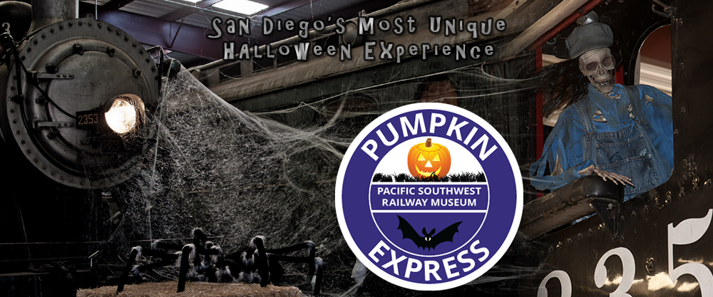 October 6, 2020 (Campo) -- Join the Pacific Southwest Railway Museum Association in its annual Pumpkin Express Halloween Celebration.  Come ride decorated vintage railcars through the San Diego county mountains as fall descends upon Campo, CA.  Walk through a themed Display Building complete with Halloween scenes, a pumpkin patch, and our creepy cast of ghosts and ghouls.