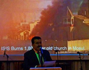 Photo, left: Noori Barka speaks as slideshow depicts Iraqi Christian refugees forced to walk across the desert, fleeing their homeland to escape ISIS terrorists with nothing but the clothes on their backs.