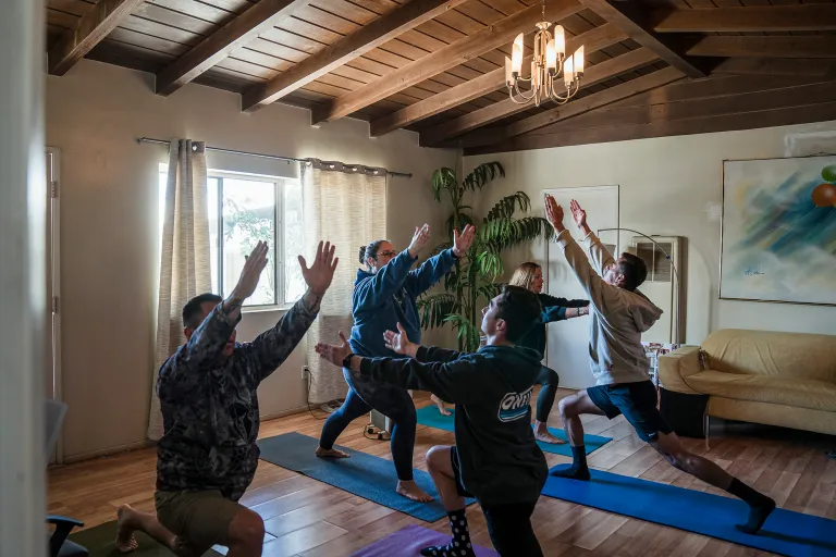 Photo, right: Cal Fire firefighters and other personnel suffering from PTSD can attend healing retreats with group and private counseling sessions and yoga sessions. Photo by Ariana Drehsler for CalMatters