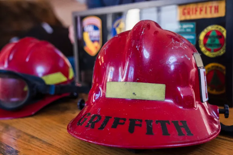 Photo, right: Griffith's structural helmet (left) and wildland fire helmet (right) at his home in Escondido. He retired after 30 years on the job. Photo by Ariana Drehsler for CalMatters