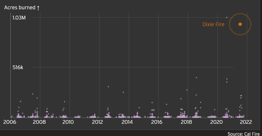 Photo, left: last July, the Dixie Fire ballooned into the second-largest fire in recent history.