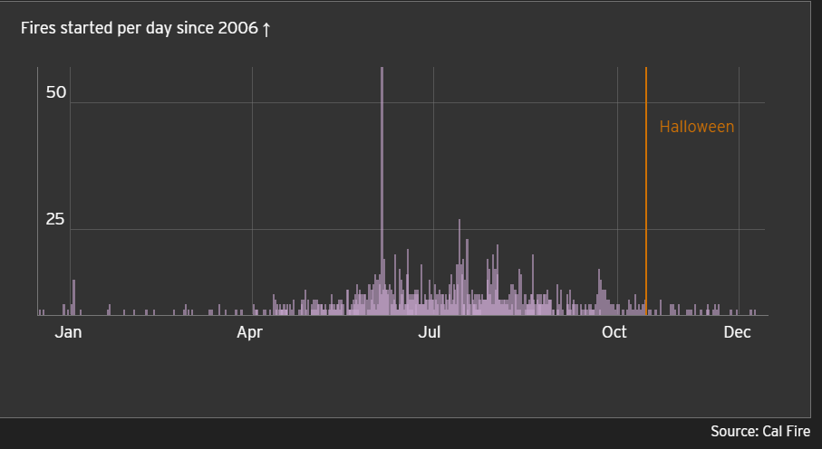 Photo, left: late fall isn’t generally considered part of California’s fire season. Since records started, only 4% or so of fires have started in November or December.