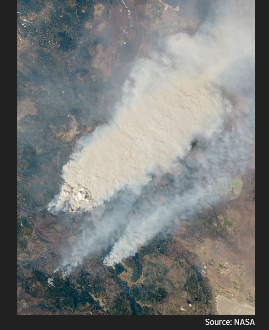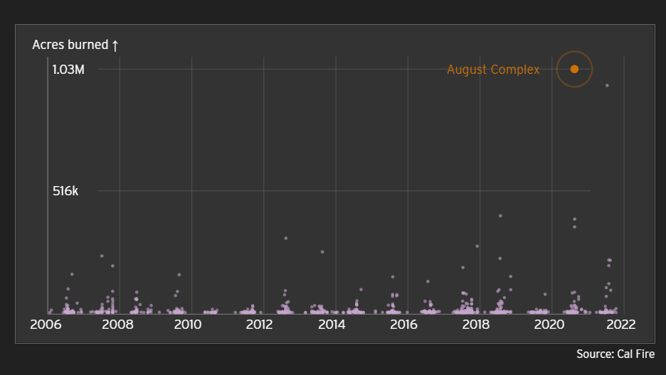 Photo, left: in August 2020, lightning struck California more than 12,000 times during a tropical storm, which created more than 500 fires. 37 of those combined to become the August Complex, the third fire we are examining.
