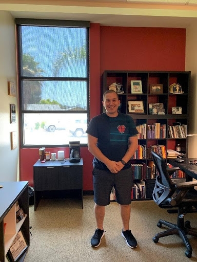 Wearing athletic attire and sporting a high and dry hair cut, Pastor Ferguson sits at his office desk in Christ Lutheran Church, La Mesa. His short-sleeve shirt shows arm tattoos, particularly the large Hebrew letters which spell out “Ahava.” Loosely translated, this means steadfast love, a Hebrew version of agape.