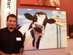 Divine Bovine: Artist Lionel Talaro mugs for the camera alongside his creation, "Elvis Cow", on display at O'Dunn Fine Art Gallery, La Mesa