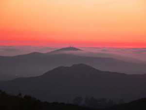 Sunset over Mt. Woodson, shot from Lakeside: photo by Miriam Raftery lLeft)