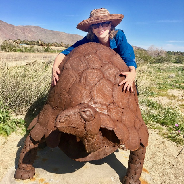 March 4, 2017 (Borrego Springs) – You never know what you’re going to find in the Anza Borrego Desert! Our editor, Miriam Raftery, headed out in search of wildflowers this weekend. It’s still 1-2 weeks too early to see fields of flowers in bloom, but she did get some close-ups of early blossoms, scenic shots and an up-close look at some of the many whimsical sculptures dotting the desert terrain.