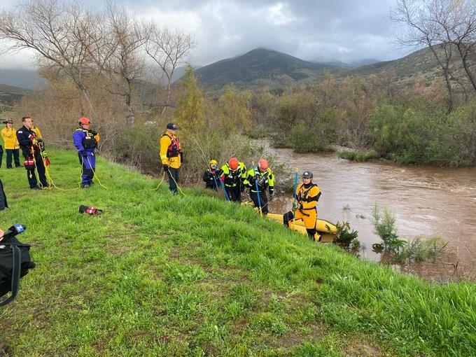 Photo, left via Cal Fire/San Diego Fire Authority: Swiftwater rescue crew saved two people near Otay Lakes swept away by floodwaters, one of several rescues conducted yesterday. The patients have been transported to local hospitals.