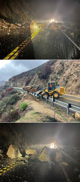 Photos, below, via CalTrans: crews worked to remove large boulders that fell on SR-94 at Otay Lakes Road, Barrett Lakes Road, and SR 188, a reminder to avoid unnecessary travel during storms and to check live road conditions if you must travel at quickmap.dot.ca.gov or @CaltransHQ on Twitter.