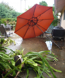 I arrived home to find patio umbrellas toppled and tiki torches that had gone airborn (photo, right).  Trashcans and pottery planters had tipped over and a wooden fence at our home sustained significant damage.