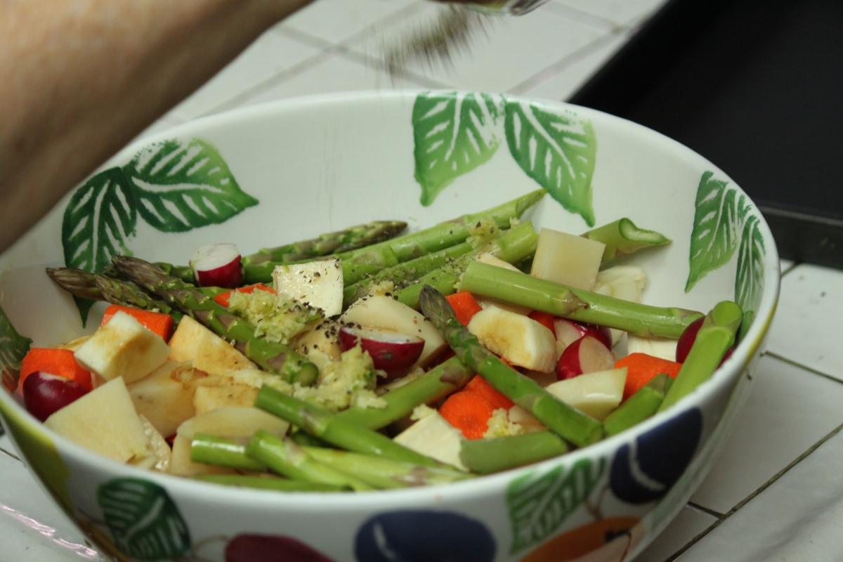 - In a large mixing bowl add potatoes, carrots, asparagus, radishes, parsnips and garlic. Drizzle with olive oil, add season with remainder of ingredients. Toss to combine until well coated.
