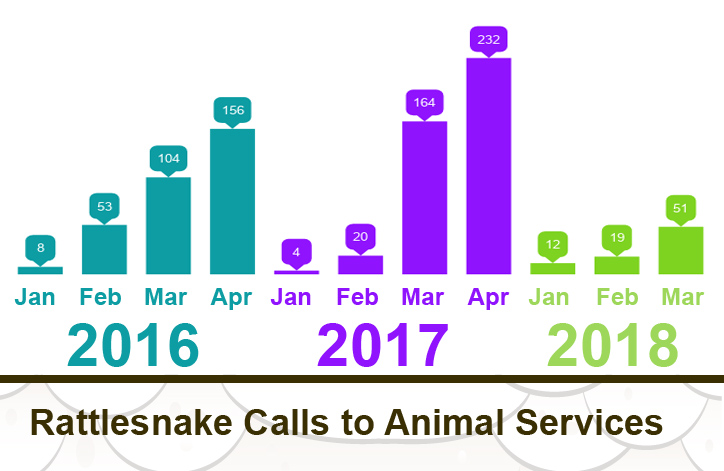 So far, County Animal Services has responded to 82 rattlesnake calls between Jan. 1 and March 31. Those numbers are low compared to the same time frame in 2017 when calls rose to 188. In 2016, the first three months showed 165 calls.
