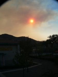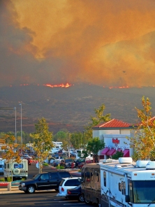 Later during the seemingly endless firestorm, evacuees were moved from the school I’d visited as flames threatened that area, too. I went to a shopping center in Rancho San Diego, where Target and Hooley’s are located. The scene was surreal – evacuees, some moved for the second or third time, parked in RVs or cars in the parking lot.