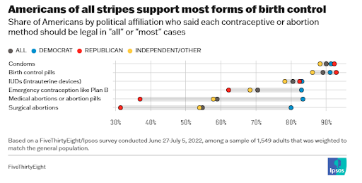 A 2022 poll by FiveThirtyEight/Ipsos found that well above 90% of Americans including over 90% of Republicans support access to birth control pills and condoms, over 80% said they support access to IUDs including over 80% of Republicans, and over 80% support access to emergency contraception such as Plan B, Including over 60% of Republicans. The partisan divide becomes apparent however on access to medication abortions/abortion pills, still backed by well over 80% of Americans, but less than 40% of Republicans.  As for surgical abortions, 80% of Americans support access, but just over 30% of Republicans favor access to surgical abortions.