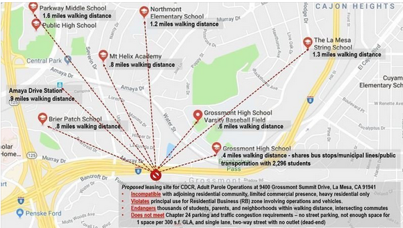 The CDCR says it wants to locate a office in East County, which currently has no parole office, because many parolees live there. The building would include 65 employees, of whom about 45 would be parole officers, each supervising dozens of parolees from a building with 41 parking spaces. Each parolee must visit the site at least once upon release from state prison and thereafter talk with their parole officer monthly either by visiting the parole office or having a parole officer visit the parolee’s home.