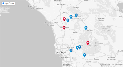 Pala reservation, Pauma Valley, Pauma reservation, Poway, Ramona, Ranchita, Rancho Bernardo, Rancho Santa Fe, Rincon reservation, San Diego, San Marcos, San Pasqual Reservation, Santa Ysabel, Santa Ysabel reservation, Santee, Solana Beach, Sycuan  reservation, Valley Center, Viejas Reservation, and Warner Springs.