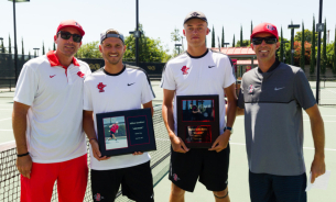 Photo: Flanked by assistant coach Jeff Thomsen and head coach Gene Carswell, respectively, seniors Milen Ianakiev and Marko Goles-Babic were honored prior to the Aztecs' win over Santa Clara on Friday. Courtesy goaztecs.com