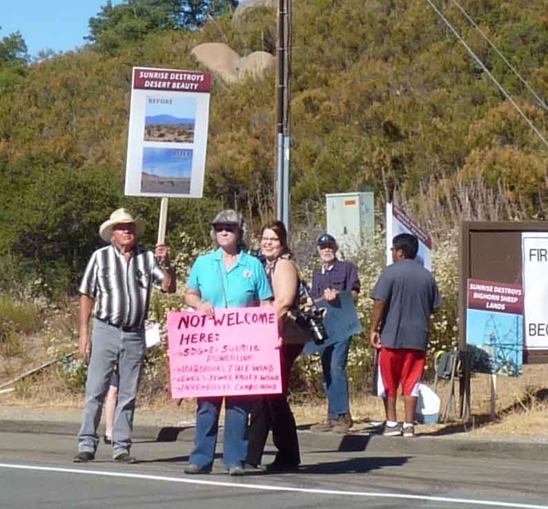 He referred to some two dozen protests who greeted party-goers at the Japatul freeway offramp ramp with signs showing environmental damage from Sunrise Powerlink and Ocotillo Express wind, which SDG&E has made power purchase agreements for in Ocotillo. One woman shouted “Shame on you!” as vehicles carrying VIPs drove past.