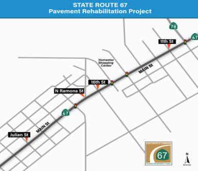 February 10, 2023 (Ramona) — Caltrans construction crews will begin making pedestrian crossing ramp improvements in downtown Ramona along Main Street as part of the State Route 67 (SR-67) Pavement Rehabilitation Project.  The sidewalks will be compliant with the American with Disabilities Act (ADA).