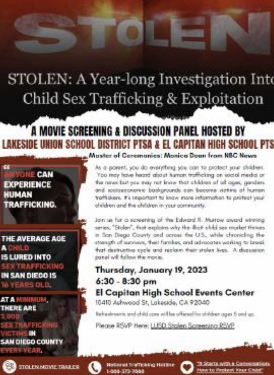 January 28, 2023 (Lakeside) –Sex trafficking of children inSan Diego “is happening in every single school district inSan Diego County,” NBC San Diego investigative reporter Monica Dean (photo, left) told parents and teachers during a showing of the documentary film “Stolen” at El Capitan High School in Lakeside on January 19.