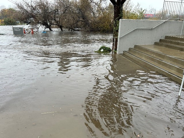 January 22, 2024 (San Diego’s East County) – Heavy rains during today’s storm caused widespread flooding, road closures, power outages, and inundation of vehicles and structures including an East County school. Flooding also prompted numerous rescues including motorists trapped in vehicles in Spring Valley and Lemon Grove, as well as homeless people stranded by rising waters along the San Diego River in Santee.