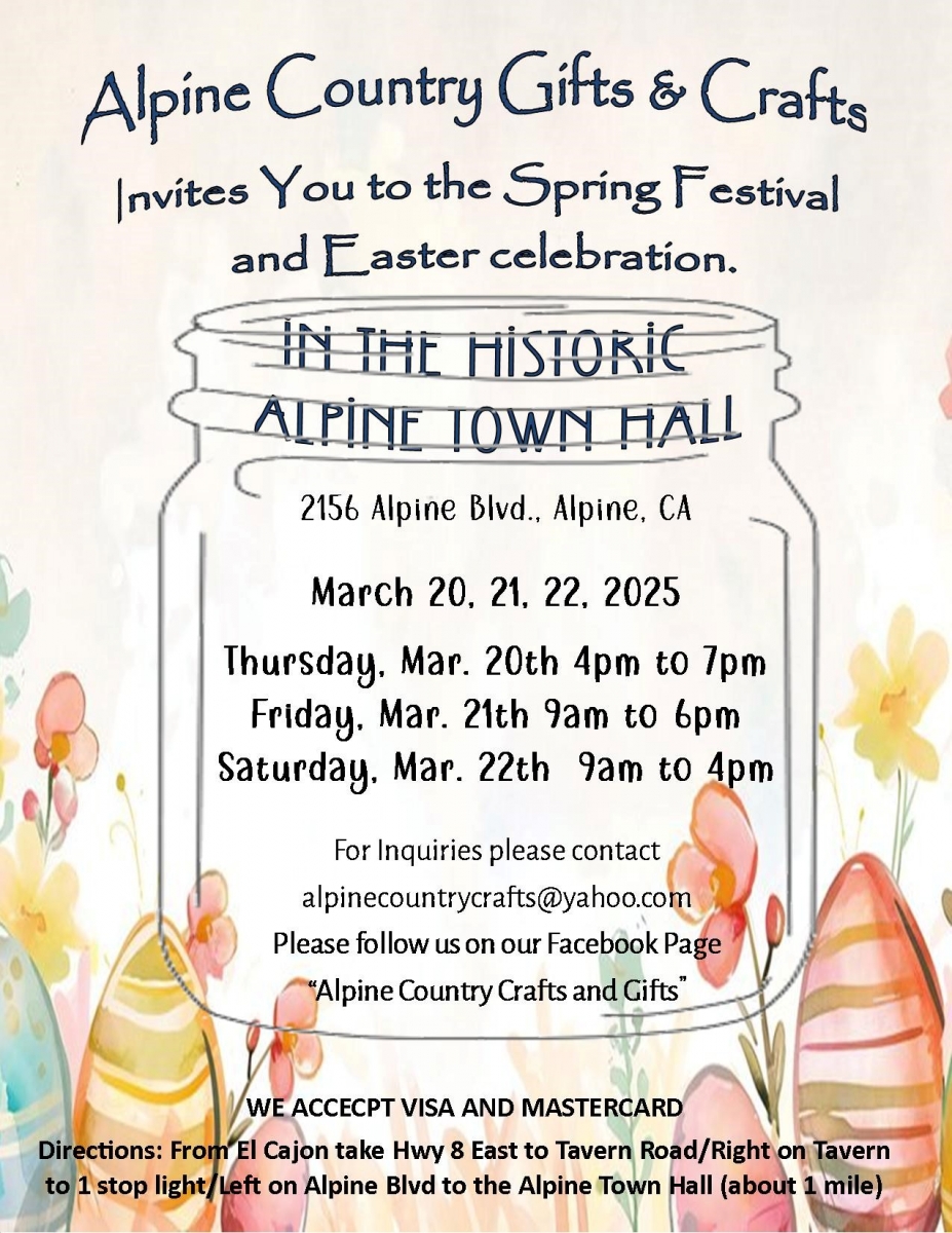March 14, 2026 (Alpine) – Dog and cat food, treats, grooming supplies, new pet toys, feeding bowls, beds, blankets, crates/carriers, leashes, collars, litter boxes and litter are among the items sought to help pets in need. You can drop off items on April 4 from 10 a.m. to 3 p.m. at the Viejas Pit Stop, 5454 Willows Road in Alpine.