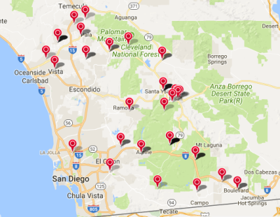 Pala reservation, Pauma Valley, Pauma reservation, Poway, Ramona, Ranchita, Rancho Bernardo, Rancho Santa Fe, Rincon reservation, San Diego, San Marcos, San Pasqual Reservation, Santa Ysabel, Santa Ysabel reservation, Santee, Solana Beach, Sycuan reservation, Valley Center, Viejas Reservation, and Warner Springs.