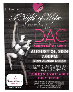 August 15, 2024 – The Element Dance Center in La Mesa announces its upcoming charity event, "A Night of Hope," gala benefiting Dancers Against Cancer. This extraordinary evening of compassion, talent, and philanthropy is set to take place on August 24 at Joan Kroc Theater, just east of La Mesa at 6611 University Ave., San Diego.