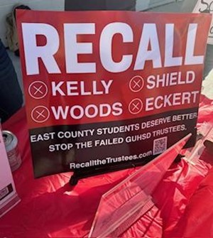 April 27, 2025 (El Cajon) -- A recall effort is underway seeking to oust four trustees on the Grossmont Union High School District Board: Scott Eckert, Robert Shield, Gary Woods,PhD, and Jim Kelly. At the April 24 GUHSD board meeting at Grossmont High School, Andy Trimlett held up four notices of intent to recall the trustees, telling the four trustees, “You have refused to listen to your community, so we are launching a campaign to remove you from office.”