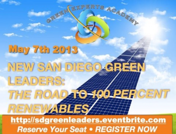 April 24, 2013 (San Diego) – Join San Diego’s green leaders at the Green Experts Academy on May 7 from 5:30 to 9 p.m. Discover the latest initiatives as San Diego moves toward a carbon-free future. Learn cutting edge info on job creation and green policy, plus best practices form global solar leaders that could help San Diego rapidly reach 100% renewable energy utilization.