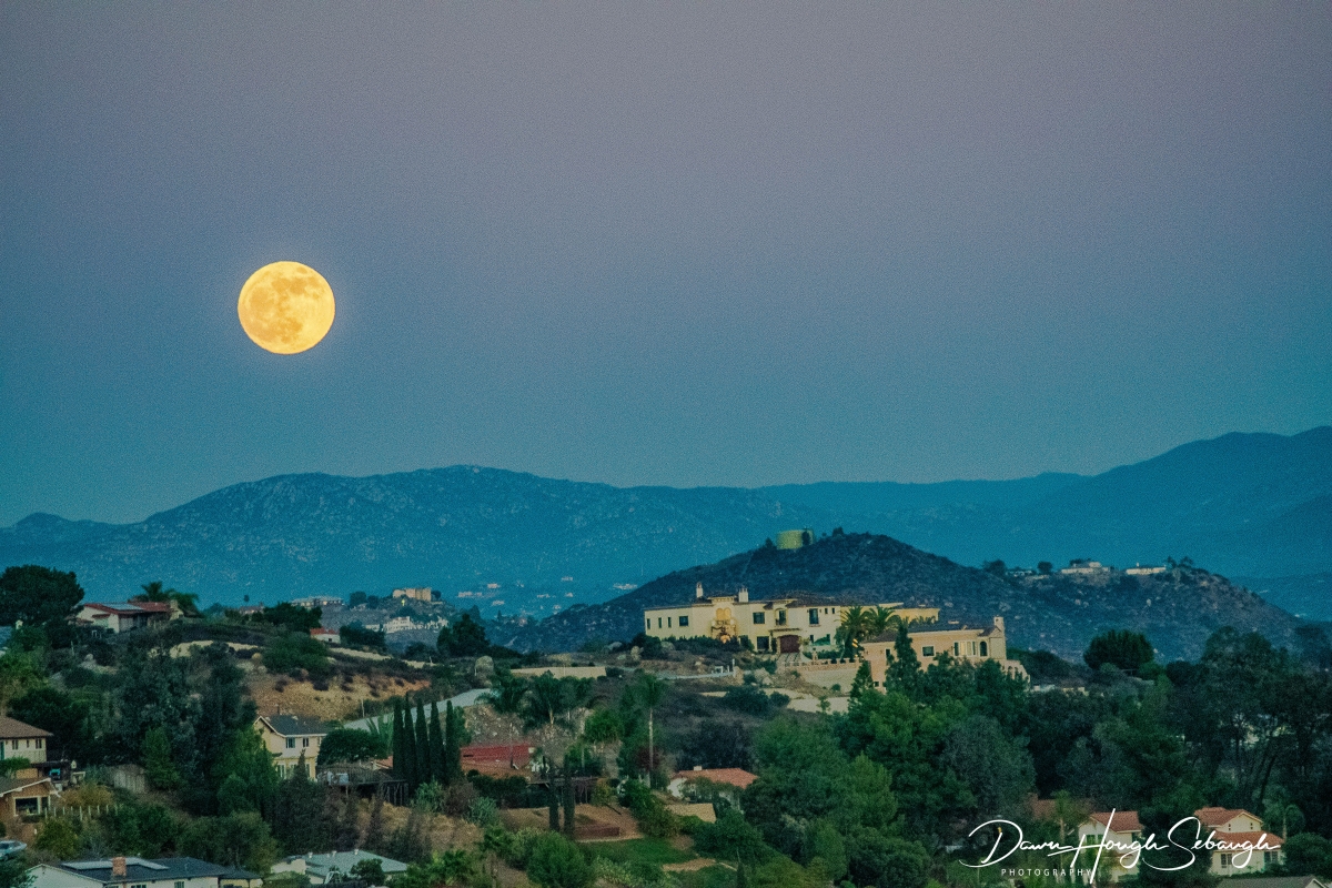 November 30, 2020 (Casa De Oro) – Dawn Hough Sebaugh sent in this photo taken from the deck of her Mt. Helix home, looking eastward as a golden-hued moon rose over East County’s mountains.