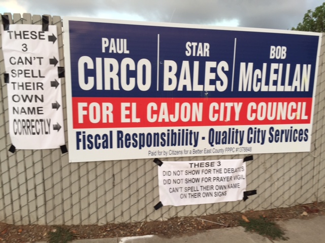 November 5, 2016 (El  Cajon)—Anonymous citizens have added commentary above and below a sign touting three conservative candidates for El Cajon City Council: Paul  Circo,  Star Bales and Bob McClellan.