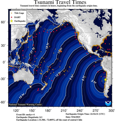 September 16, 2015 (Orange County, California) -- An 8.3 magnitude earthquake has occurred off the coast of Chile has led to issuance of a Tsunami Advisory for the California coast from Orange County north to San Luis Obispo. San Diego County is not included in the advisory.