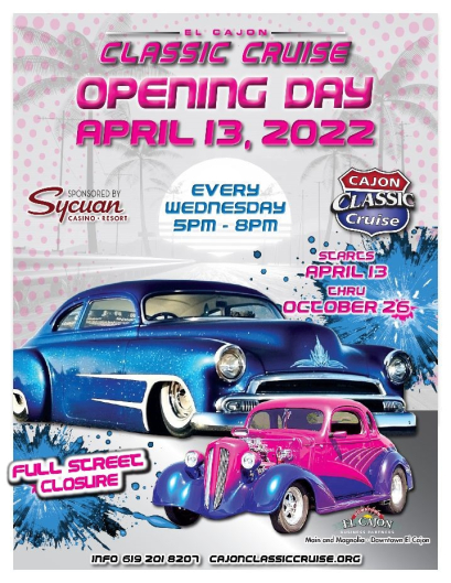 May 1, 2009 (El Cajon)--Cajon Classic Cruise, the largest weekly classic car show in Southern California, returns to Main Street in Downtown El Cajon on Wednesday, May 13 from 5:00 to 8:00 pm with its 2009 Season Opener. In addition to viewing classic cars, the grand opening includes live music by the little Efert Band, a DJ from 104.2 FM radio, and children's activities including face-painting by a clown, a bounce house and jump slide.