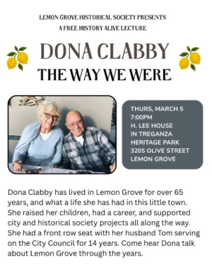 Lemon Grove has long prided itself as the "Best Climate on Earth," but its history includes much more than the weather, and Dona Clabby has lived in the city for more than 65 years, with a plethora of memories she will touch on at the lectre.