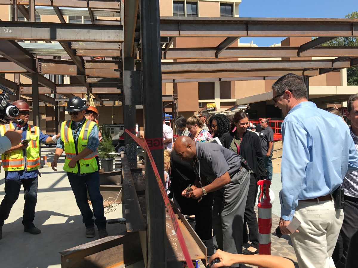 June 30, 2017 (San Diego) -- San Diego-based general contractor Pacific Building Group raised the final beam Thursday to complete or “top out” the steel structure of Alvarado Hospital Medical Center’s expanded emergency department while 100 guests looked on. Hospital staff and community members signed the beam, now situated within the structure.