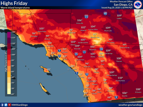 October 1, 2020 (San Diego’s East County) – A heat wave is forecast to continue through Friday, with temperatures 10 to 20 degrees above normal. The National Weather Service has issued an excessive heat warning through 8 p..m Friday