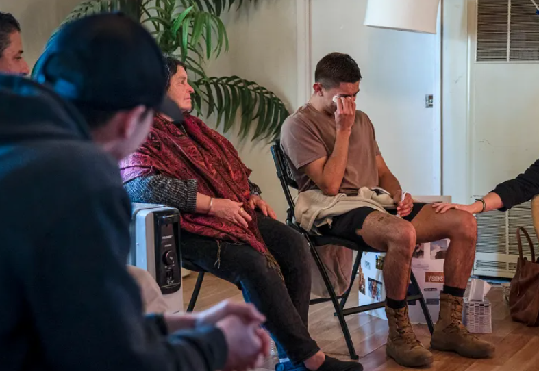 Photo:  A Cal Fire employee tries to comfort another participant during a healing retreat at the Nurturing Nest in Desert Hot Springs on Feb. 25, 2022. Photo by Ariana Drehsler for CalMatters