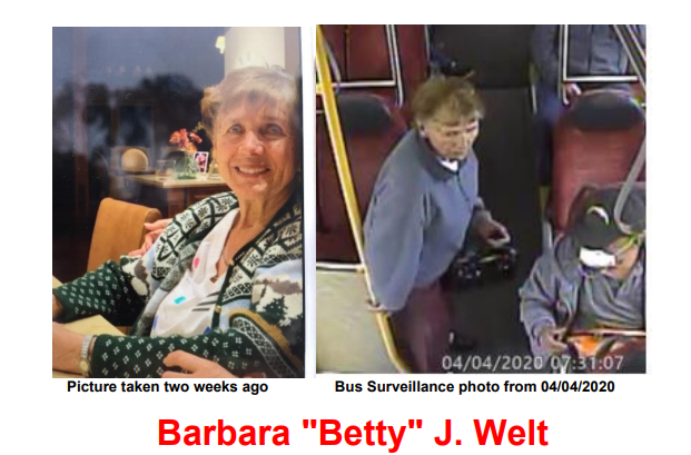 April 5, 2020 (San Diego) – The Sheriff seeks public help to find Barbara “Betty” Welt, 86, reported missing yesterday by her daughter. She has dementia and speaks with a German accent. She was last seen yesterday getting off a bus in Miramar in a blue sweatshirt, maroon pants, black shoes and carrying a black purse. She was asking for directions to Palm Springs and may be trying to get a ride to her former home there.