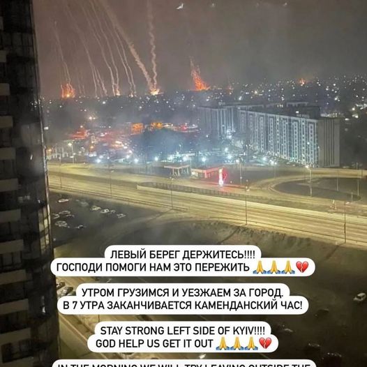 Photo, left: First night of bombing in Kyiv,via Kristine Alessio from a friend in Ukraine